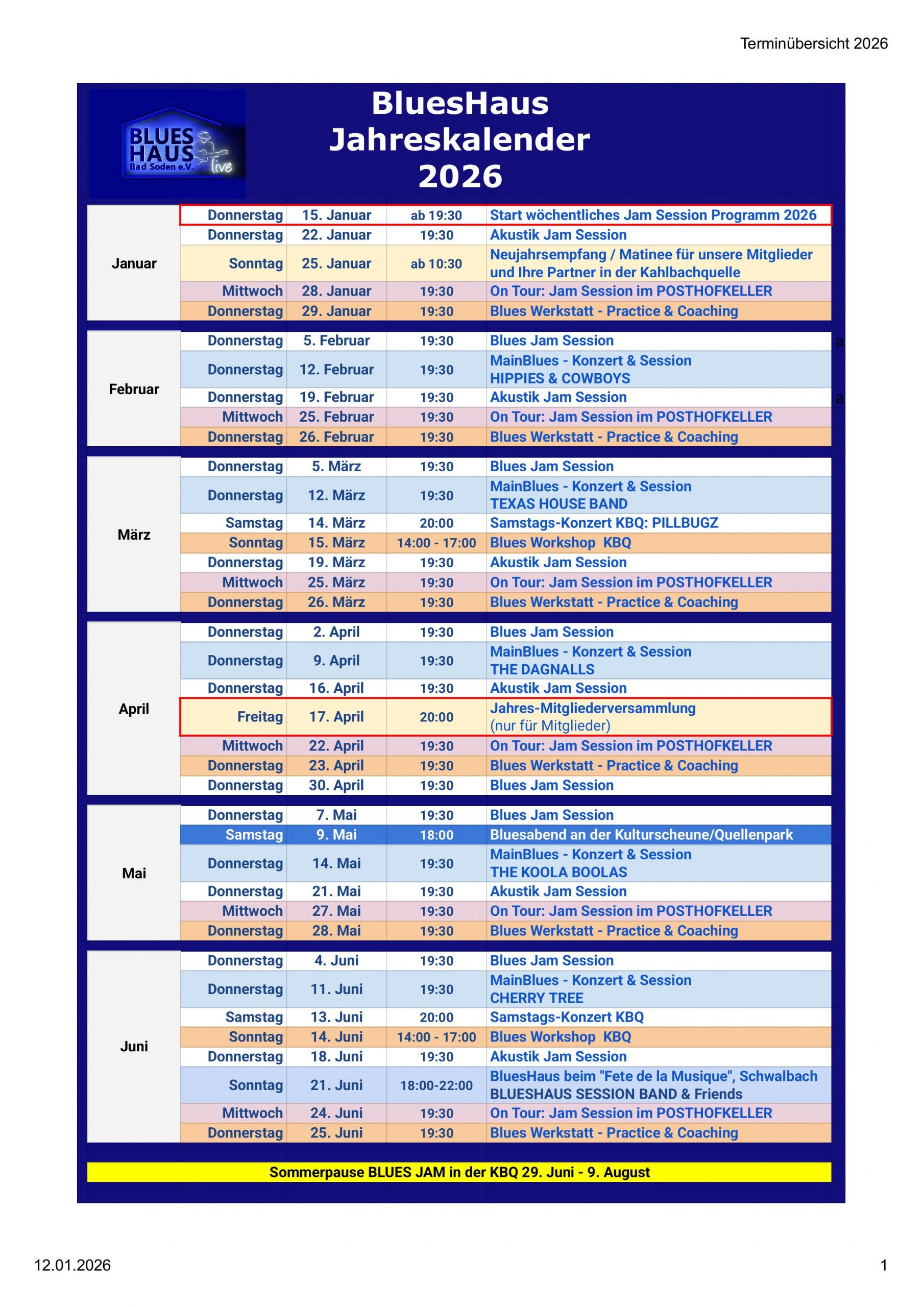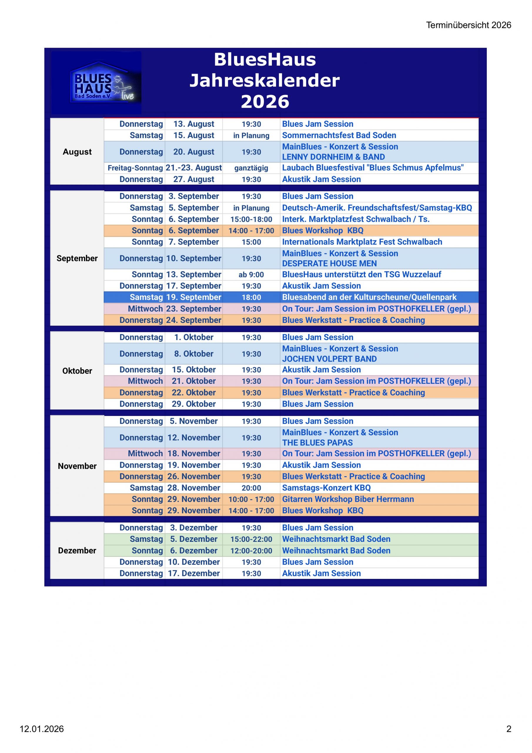 Mitreißend, authentisch, voller Groove – wir bringen die Liebe zum Blues auf die Bühne und stellen euch den Verein BluesHaus Bad Soden e.V. und unsere musikalische Gemeinschaft vor. Wir eröffnen den Abend im ersten Set mit unserer Band und laden Euch dann zum MITMACHEN in der anschließenden Session auf die OFFENE BÜHNE ein.